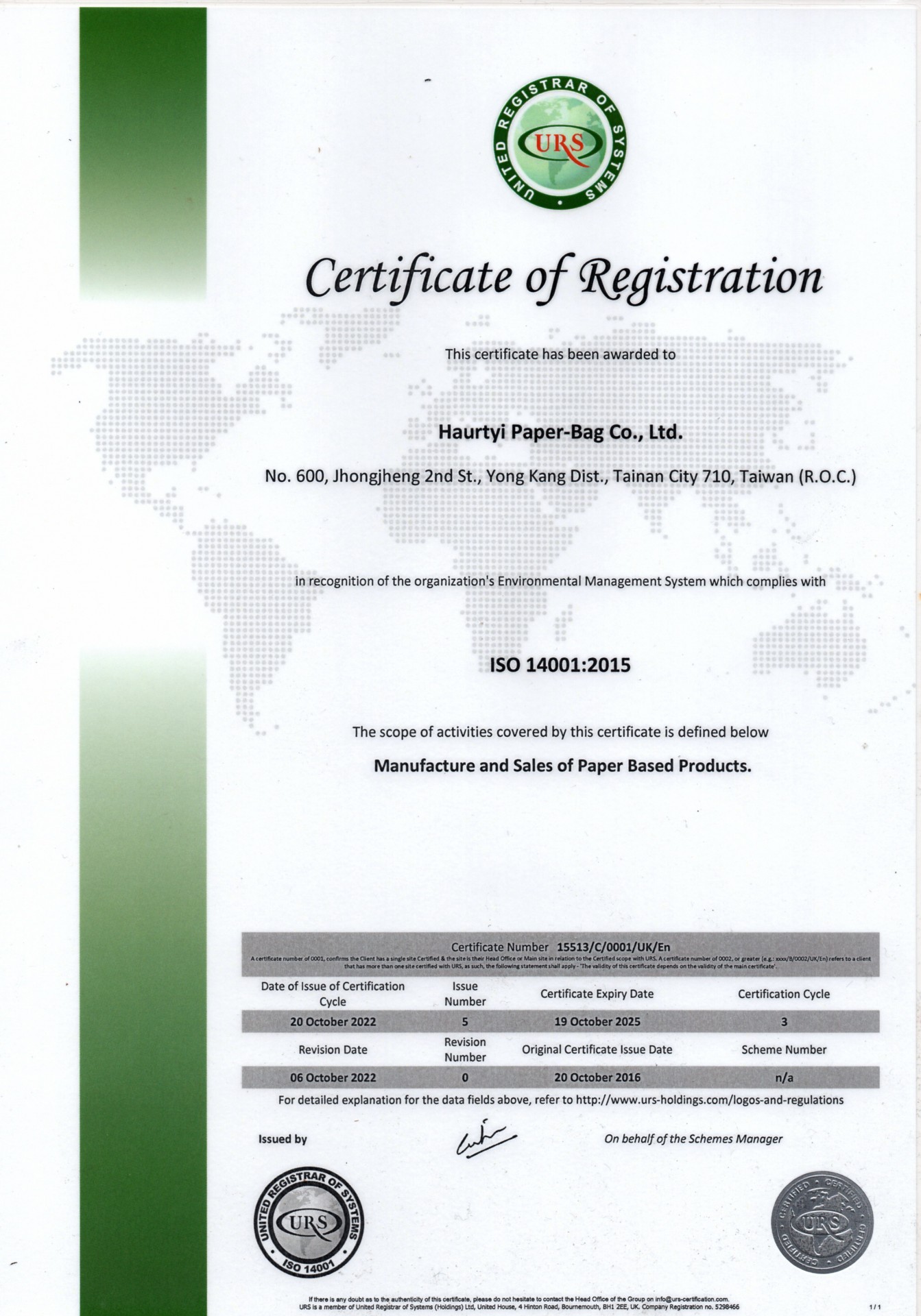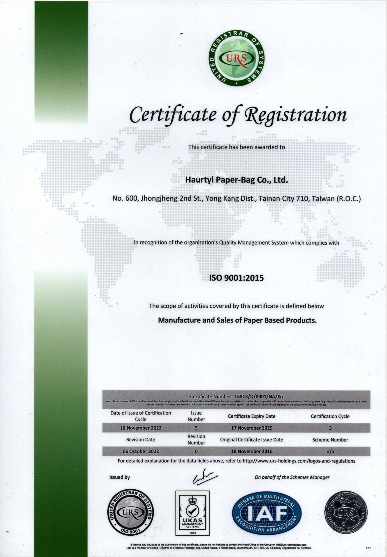 - 通過ISO 9001:2015認證,並於2015年通過ISO 14001:2015認證