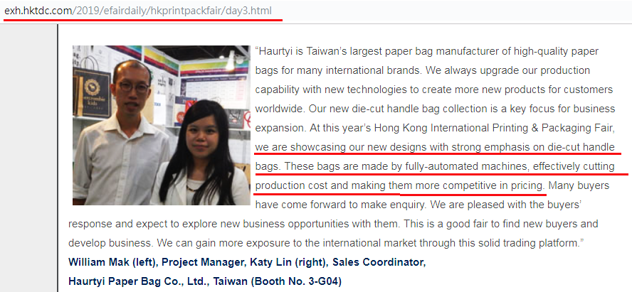 最新消息 / 展覽活動 2019-05-15 香港貿發局的專訪 香港貿發局的專訪: 豪堤紙袋在今年展示的新設計商品, 使用完全自動機器化生產的腰孔提袋,有效降低生產成本,讓市場的價格競爭更具優勢。 BACK
