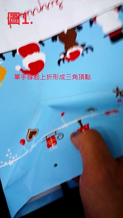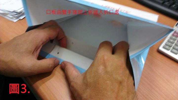 b.口板裝入時由雙手伸入(紙張平均攤開沒製造拉扯點),手指撐開上折,口板推入到底(多次練習後雙面膠就不會先接觸紙面)。