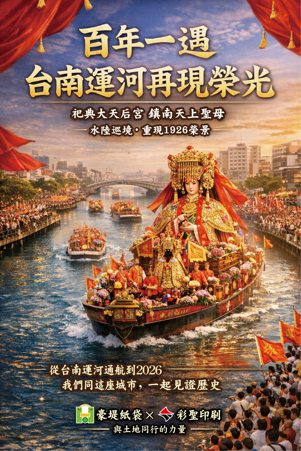 祀典大天后宮「鎮南天上聖母」睽違百年,將再度遶境,以水陸並進之姿巡遊台南運河(2026.04.11 (六) 06:30 - 19:00) 。